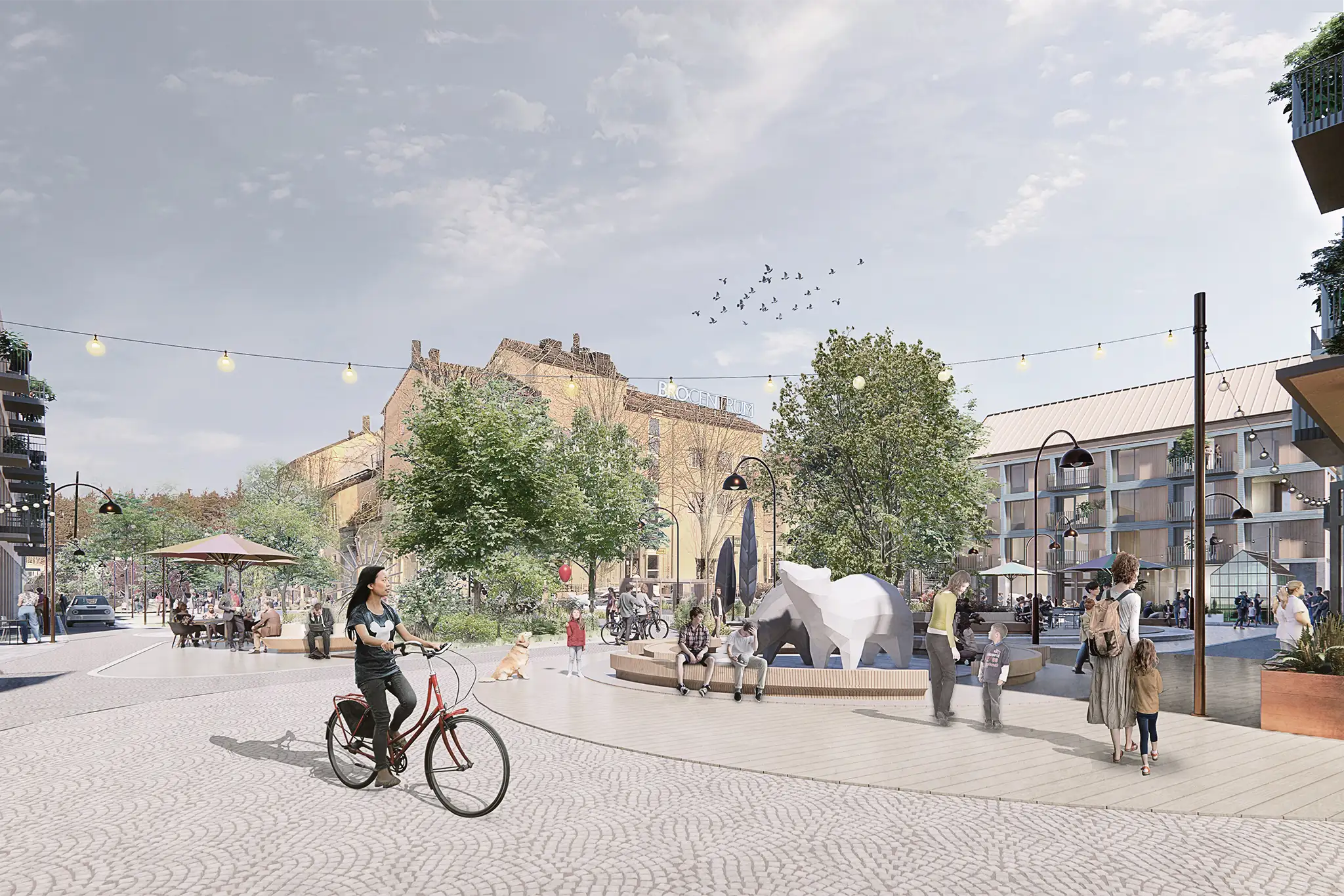Men nu ska det bli ändring på det. Den som om några år svänger in mot Bro centrum från Enköpingsvägen kommer i stället att mötas av ett livligt bostadskvarter. Längs Norrgrindsvägen löper nu nya två- och trevåningshus med butiker och kaféer i bottenplan. En bit fram öppnar sig ett nytt litet torg framför det nuvarande Bro centrum med uteplatser och butikslokaler.